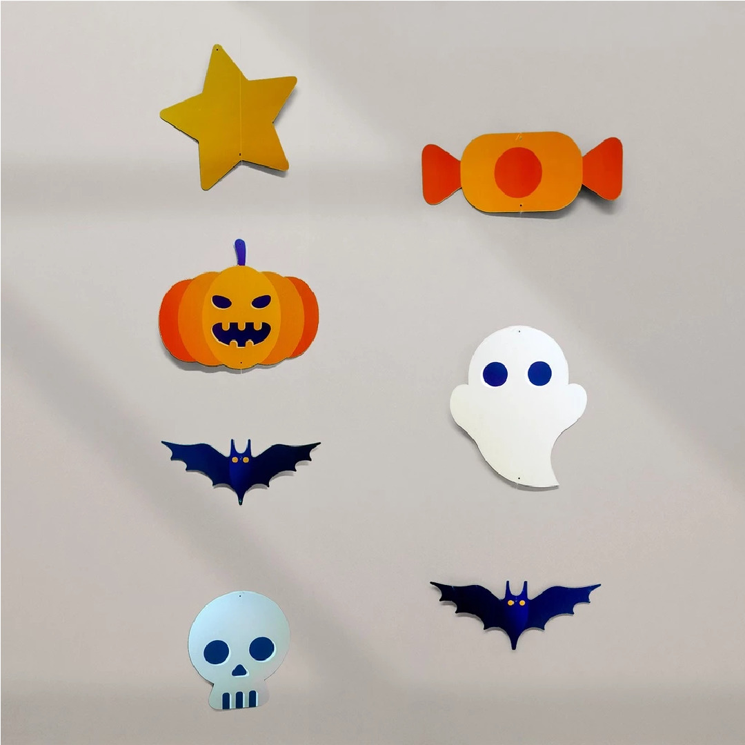 Deixe sua festa ainda mais divertida e no clima do Halloween com este kit de móbiles decorativos. Impressos frente e verso e pendurados em fio transparente, os elementos parecem flutuar no ar, trazendo um efeito criativo e cheio de estilo para a sua decoração.